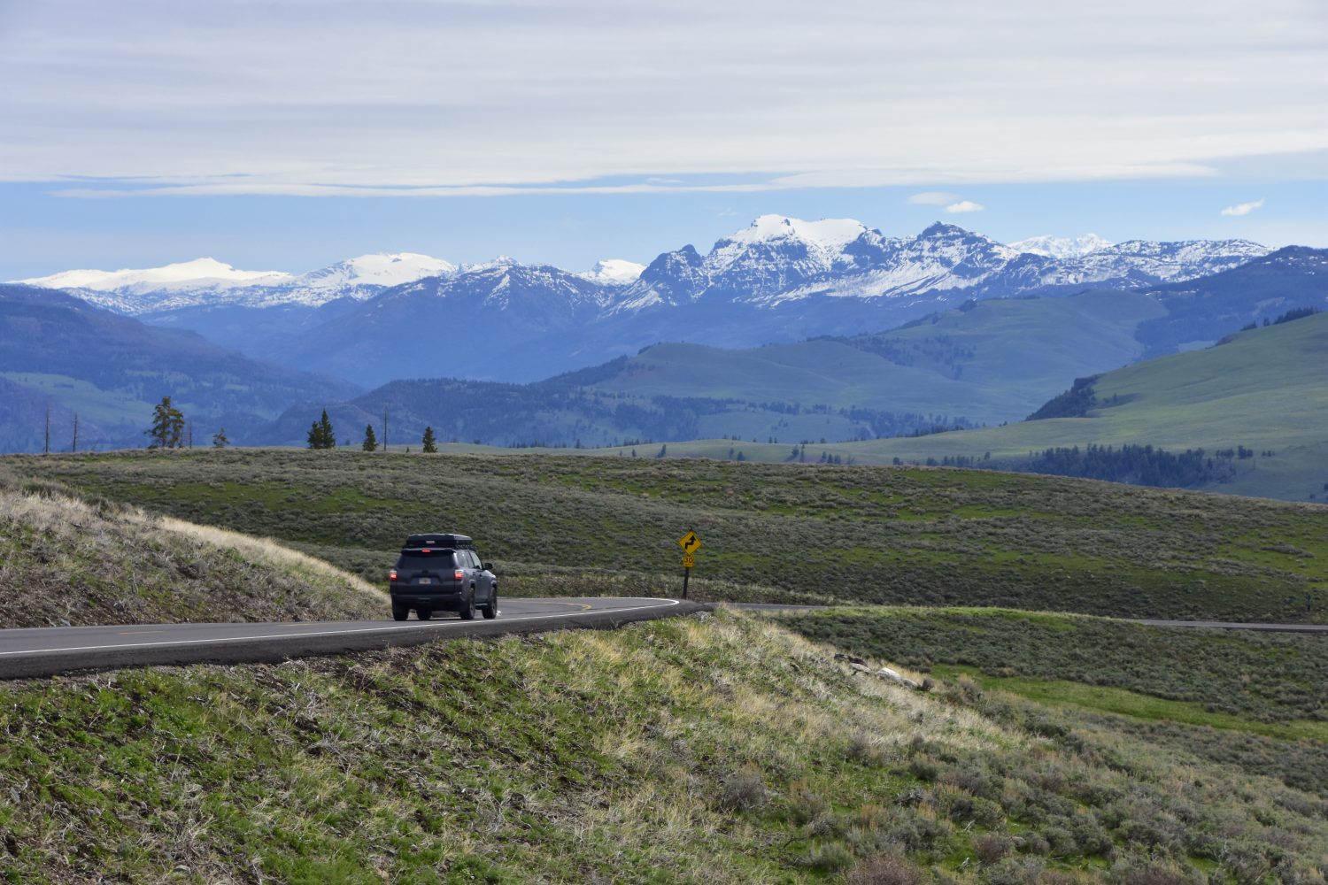 Driving across the 8,859 ft. Dunraven Pass, with a backdrop of the Absaroka Range of Mountains.