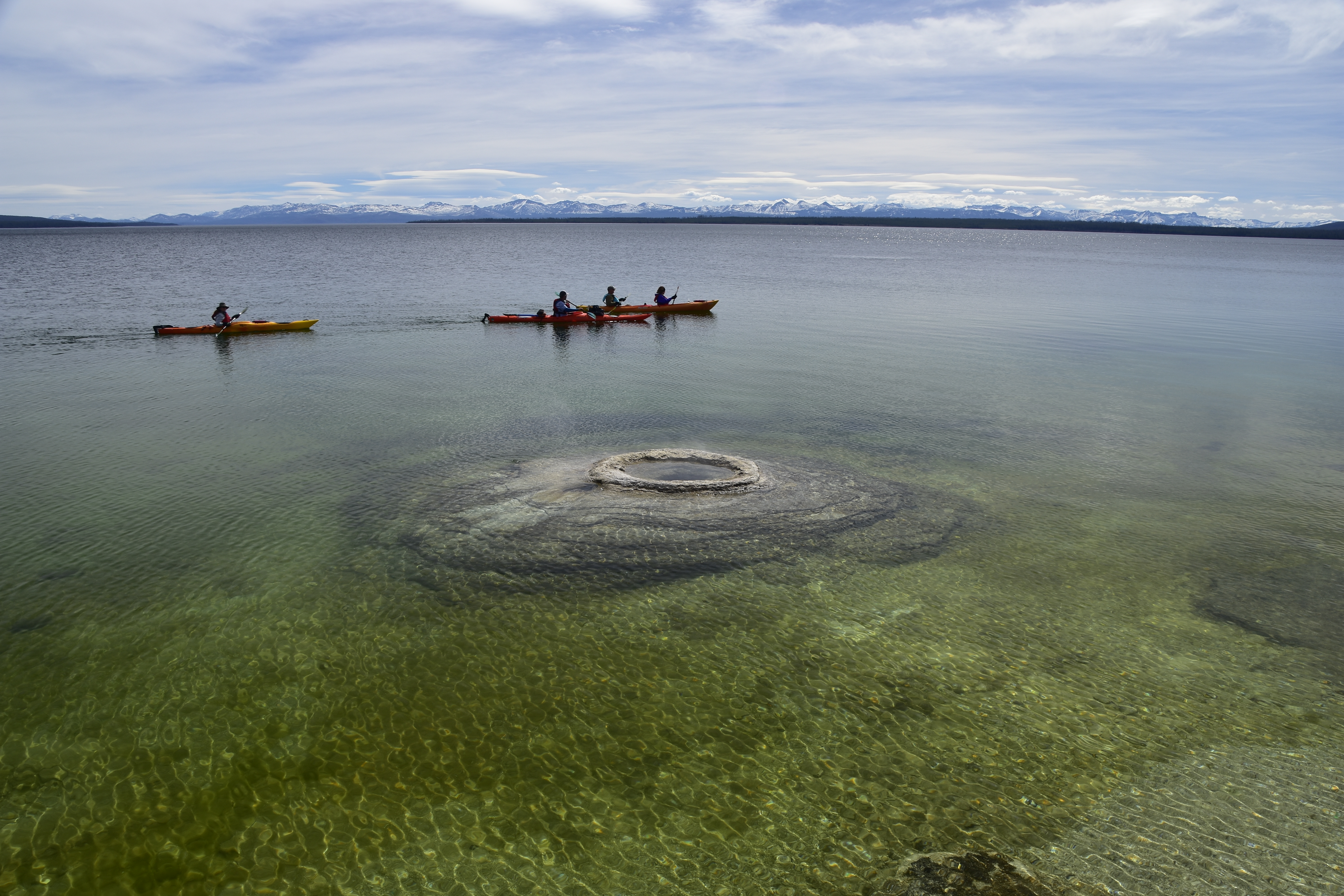 A group of canoeists passing the Fishing Cone Geyser, which is part submerged in Yellowstone Lake.
