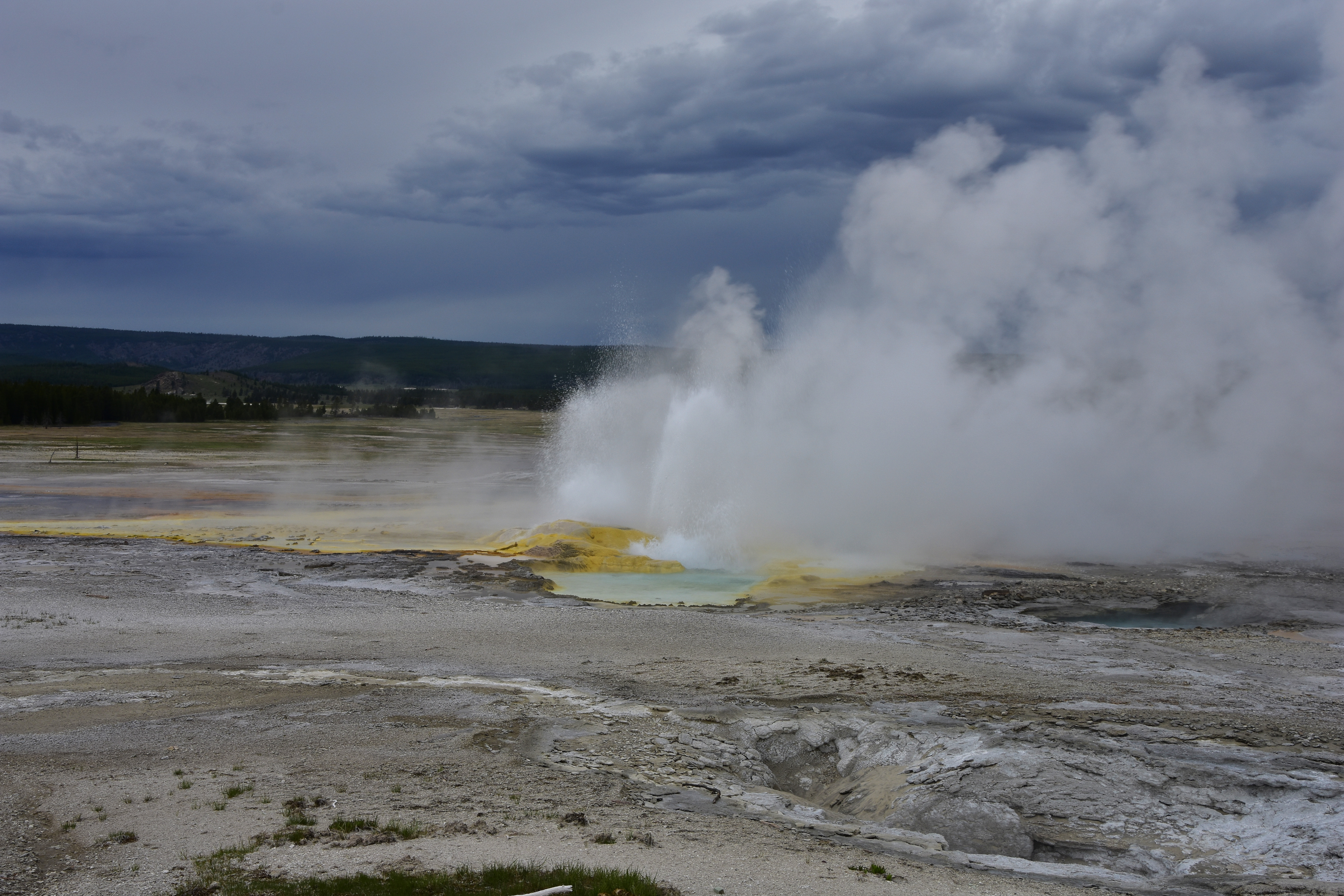 Clepsydra Geyser erupting at Fountain Paint Pot in the Lower Geyser Basin.