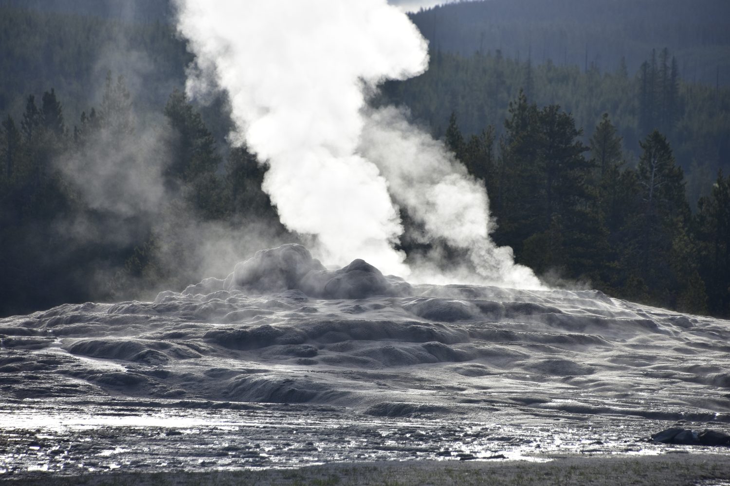 Old Faithful is the most famous, though not the highest, of all North American geysers. Here it is simmering steam, its normal state between eruptions.