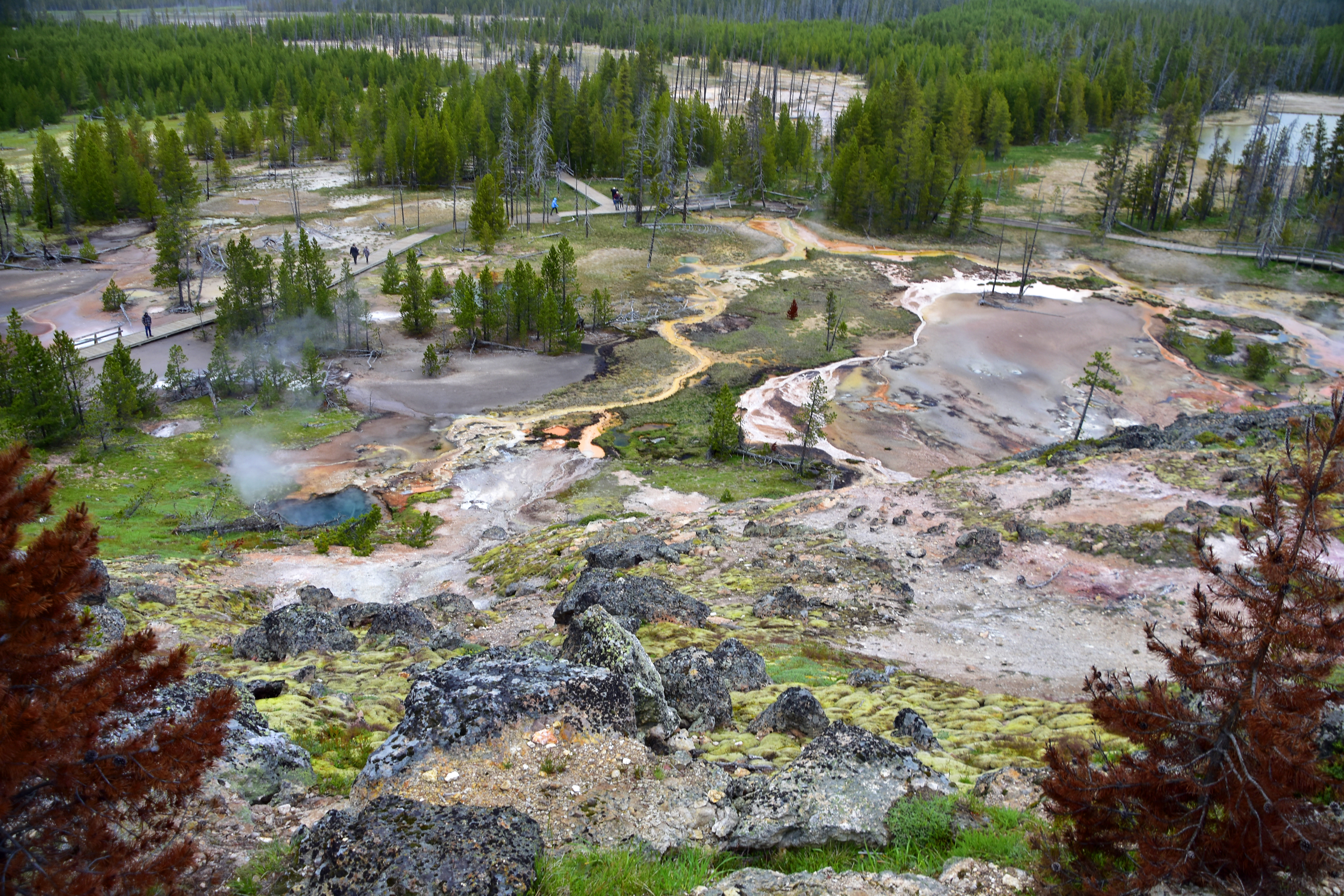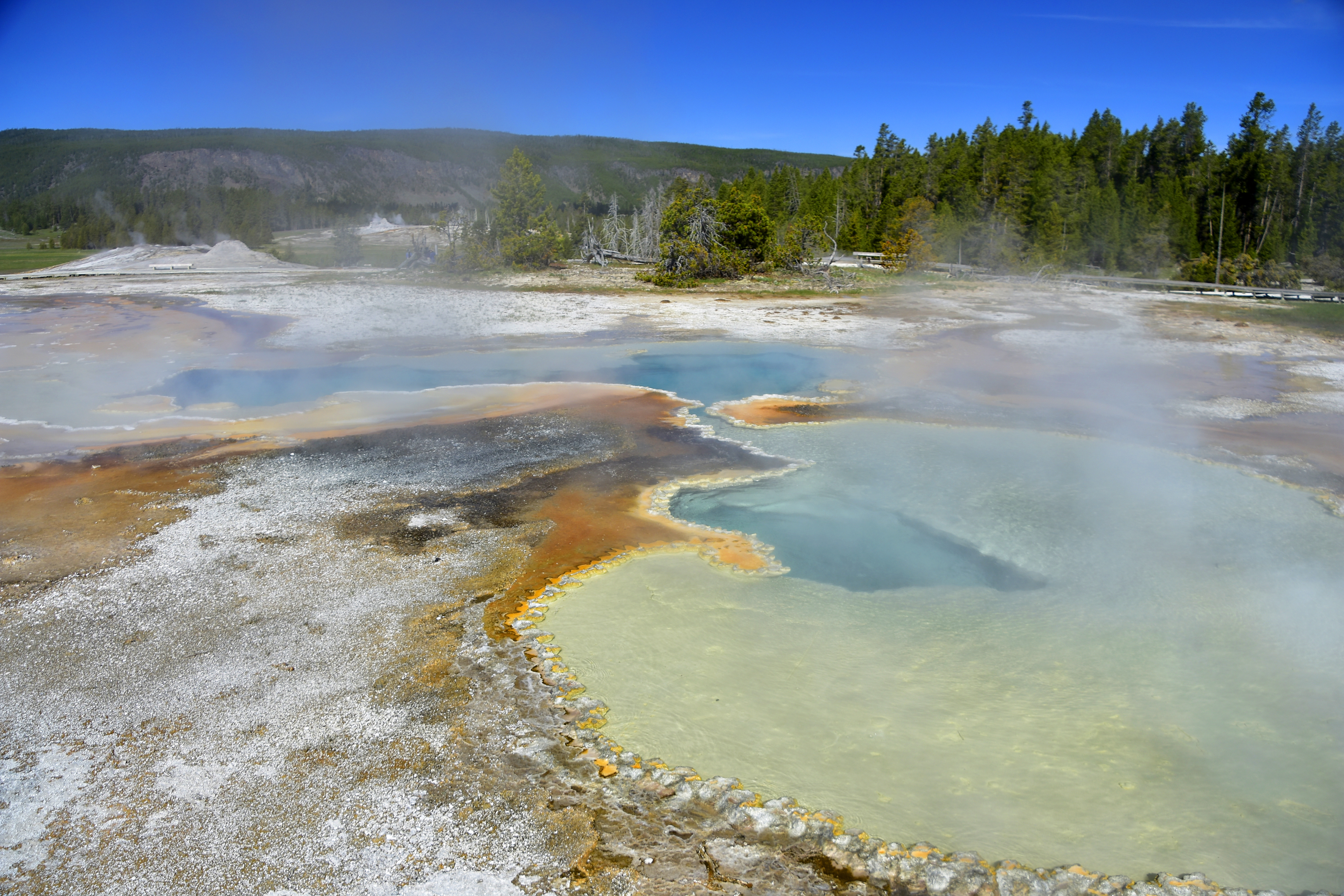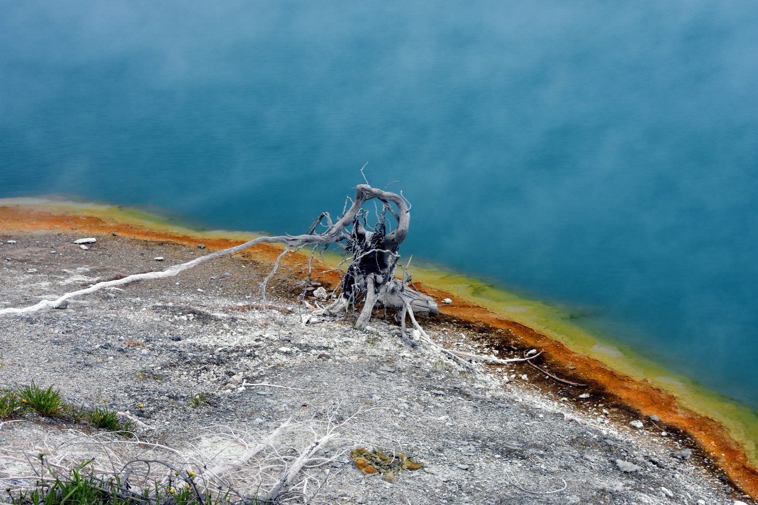 Dead trees litter the edge of the Black Diamond Pool at Biscuit Basin.