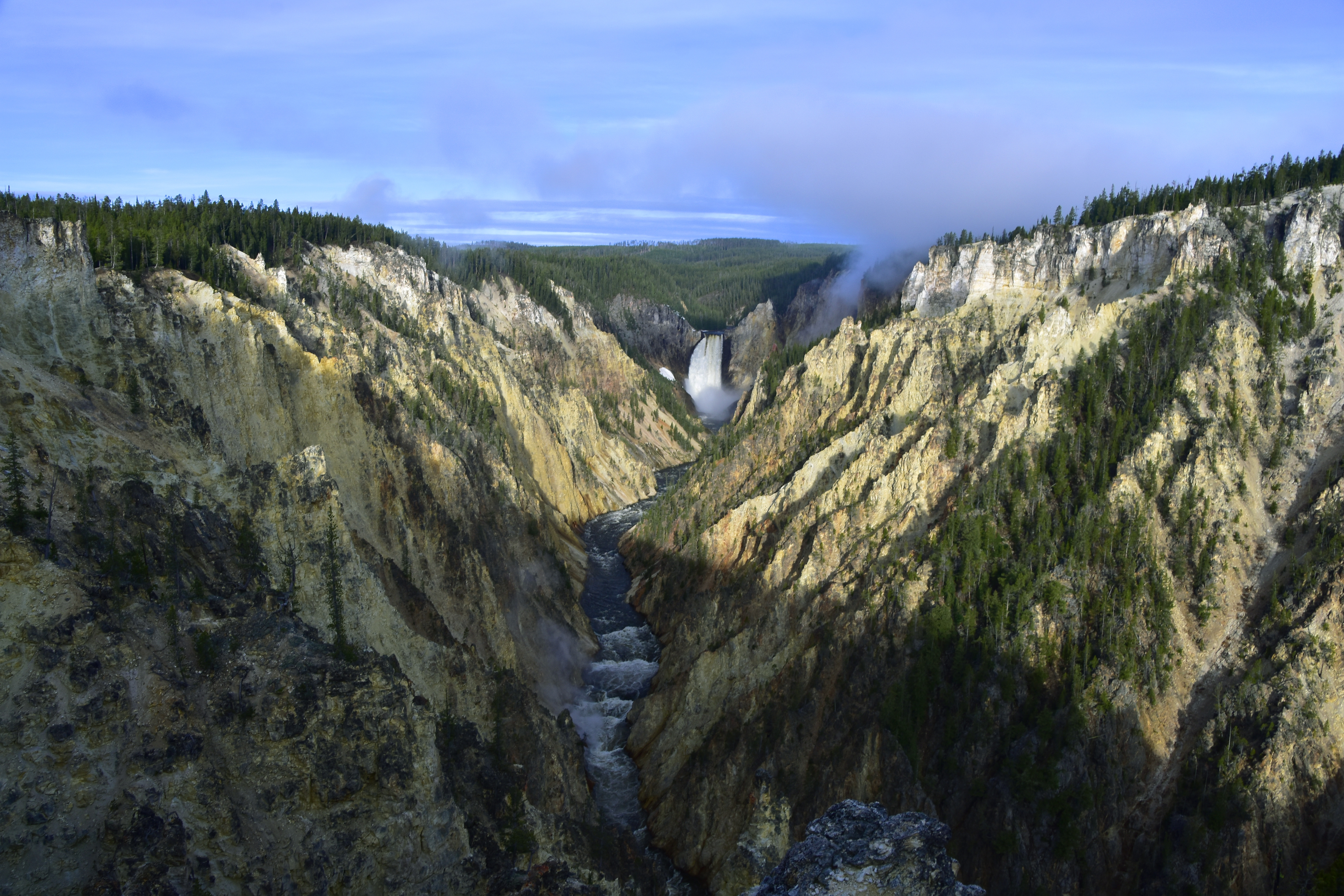 Grand Canyon of the Yellowstone is approx. 20 miles long and 1,000 ft. deep. It was formed by erosion as the Yellowstone River flowed over progressively softer, less resistant rock. The picture shows early morning sun starting to illuminate the 308ft. Lower Falls at the end of the Canyon.