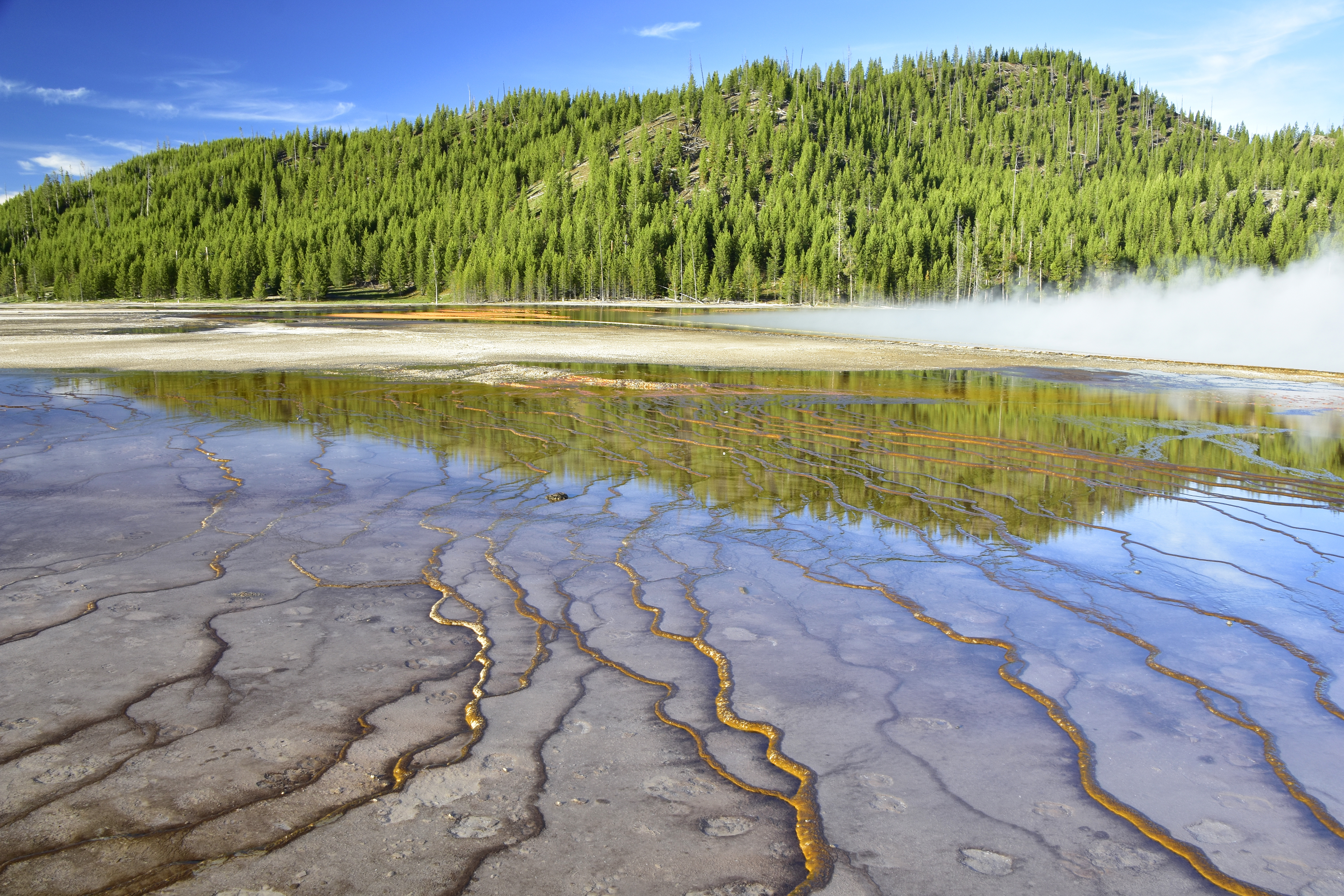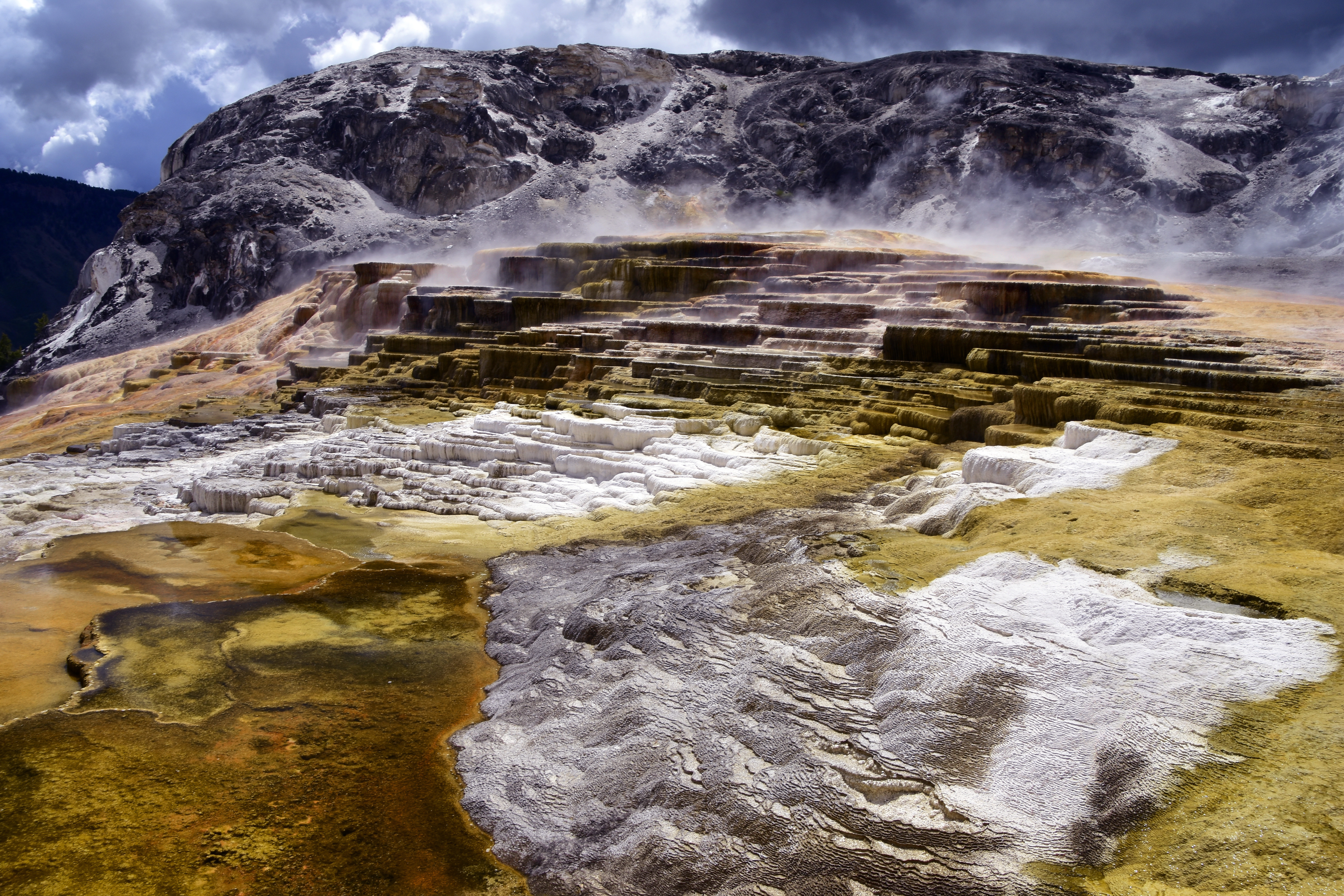 Mammoth Hot Springs Terraces – Rain waters seep into the rocks, and once they reach a certain depth, they are heated by the action of boiling magma. Then they rise back to the surface of the earth. Unlike at Norris Geysers Basin, the waters at Mammoth Hot Springs are not expelled into the air. They cross the rocks and deposit limestone sediments on the surface. The warm waters slowly flow from one basin to another, forming terraces called travertine formations.
