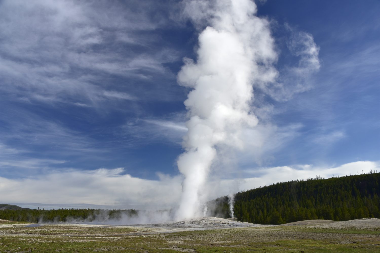 Old Faithful erupts approximately every 90 minutes and each eruption lasts up to 5 minutes. Old Faithful’s billowing steam and hot water column rises on average about 140 ft.
