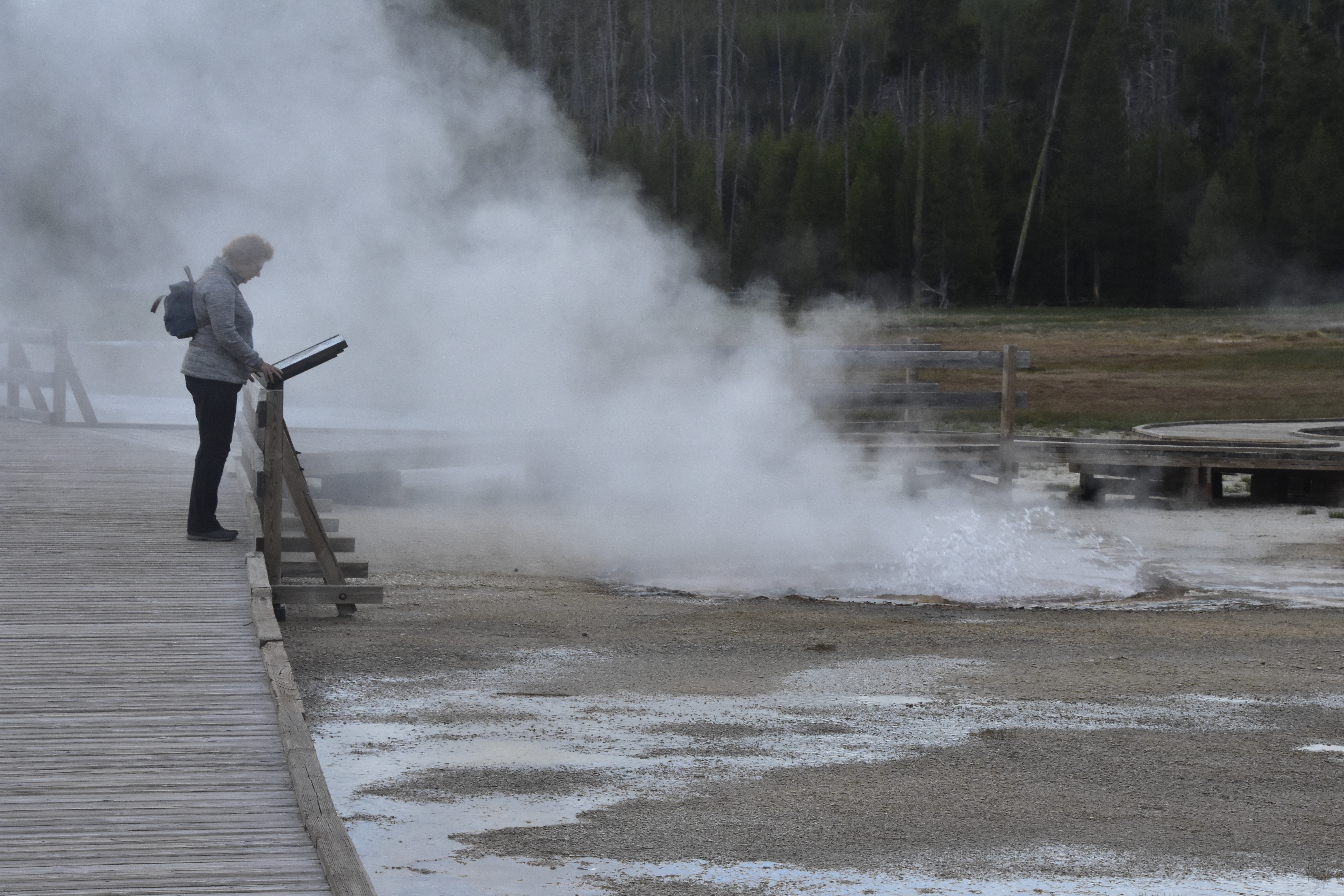 Charlotte is so engrossed in reading about the bubbling Geyser that she doesn’t realise she is about to be engulfed by steam!