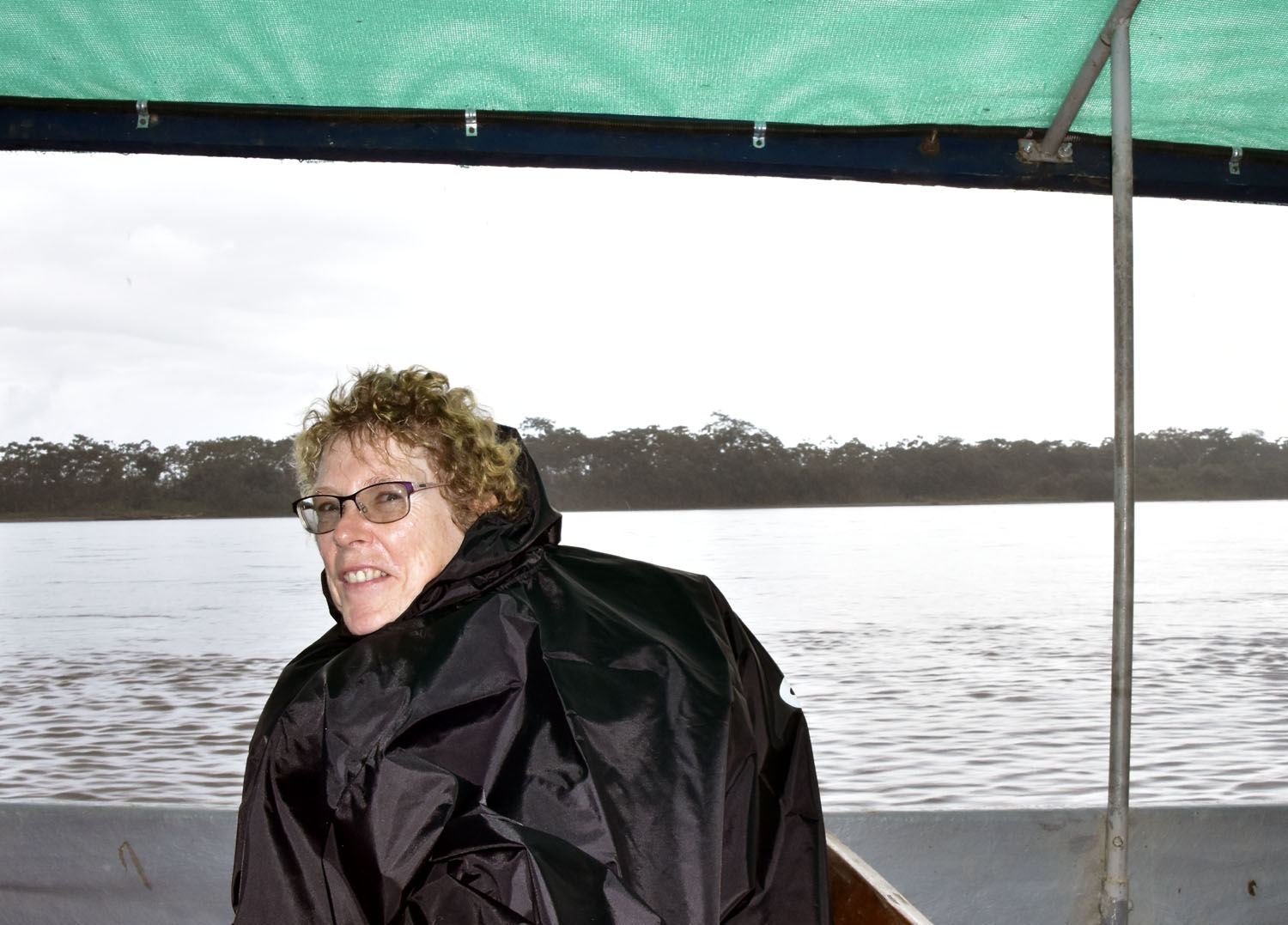 Following a 30 min flight over the Andes to Coca and a 2 hour trip in an open-sided motorised canoe on the River Napo (a tributary to the Amazon River) we arrived at our dropping off point for a 4-day adventure in the Amazon Rain Forest. A short hike and another canoe ride took us to a beautiful lake deep in the forest, where Sacha Lodge is located. Before we even arrived we understood what ‘rain’ meant, as we rode through a violent thunderstorm with torrential rain, which reduced visibility to zero. Fortunately the operators are used to this and supplied us with heavy-duty rain ponchos – the two photos below give you some idea of the experience.